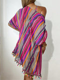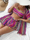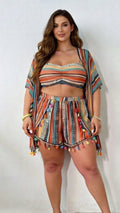 ✨Chegou o conjunto querido do verão! Com estampa geométrica vibrante e caimento confortável, esse combo 4 em 1 acompanha top, calcinha, short com detalhe em pompons e kimono leve para arrasar nos dias de sol. ✨