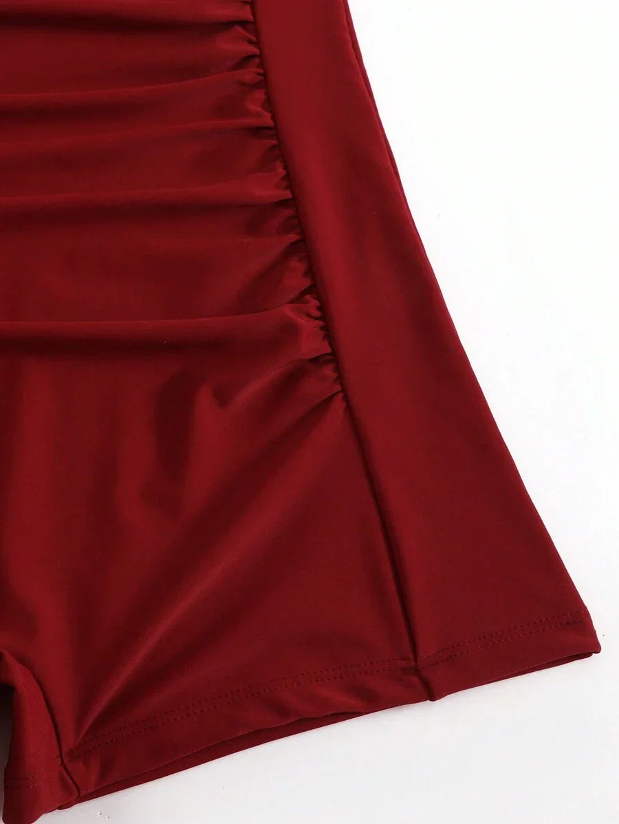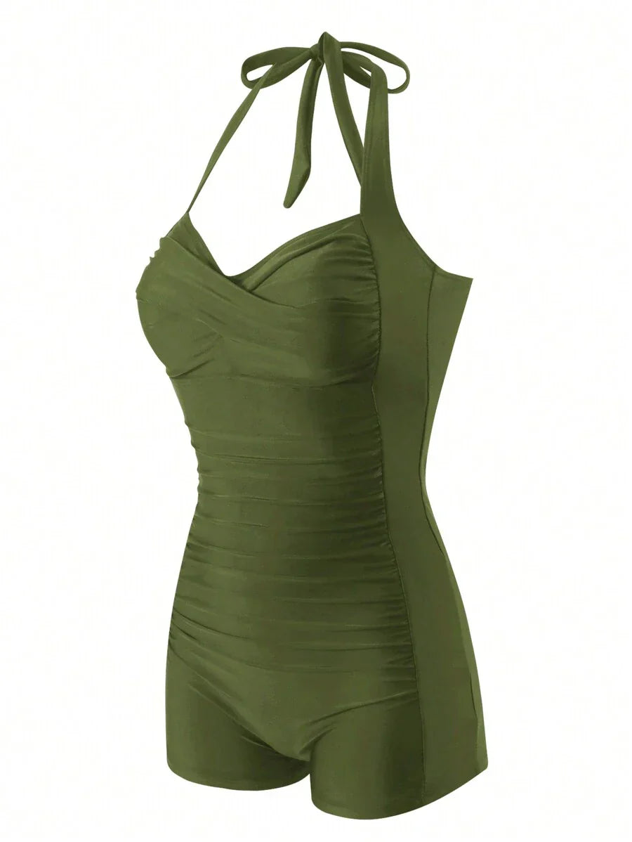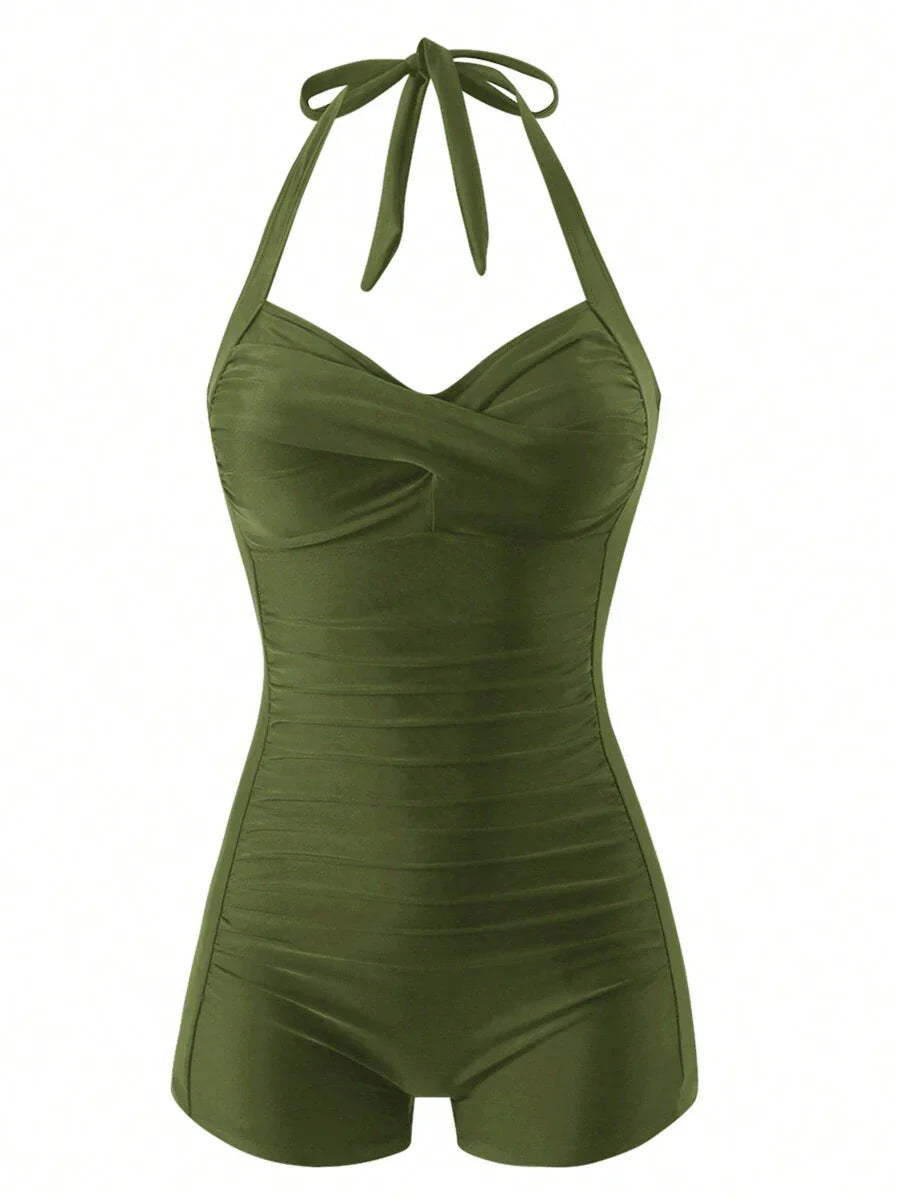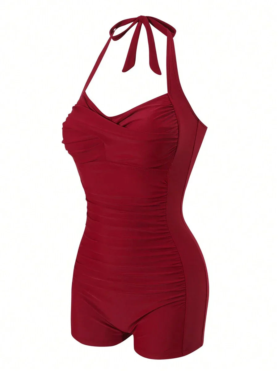 Inspirado no glamour das décadas passadas, este maiô une sofisticação e conforto com um toque retrô irresistível. Seu design com franzidos sutis no abdômen proporciona efeito modelador, enquanto o decote estruturado valoriza o colo com delicadeza. Ideal para quem busca elegância atemporal e sustentação impecável.