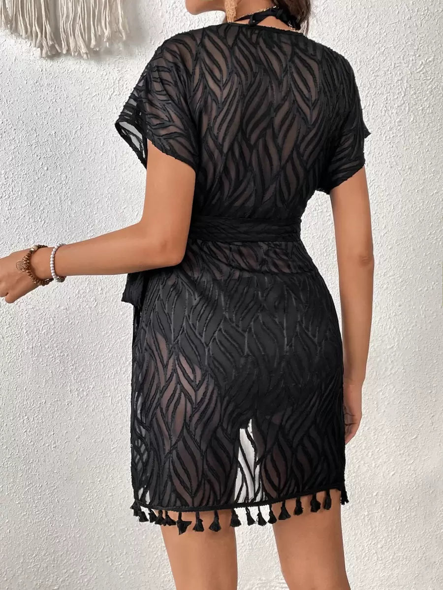 A Saída de Praia Bella Riviera é puro charme e movimento. Seu modelo transpassado com faixa na cintura valoriza as curvas com sutileza, enquanto o tecido leve e texturizado garante frescor e fluidez. Os detalhes em franjas na barra trazem um toque artesanal que traduz o verdadeiro espírito do verão.