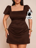 Vestido Curto Cetim Manga Bufante Decote Quadrado Plus Size