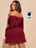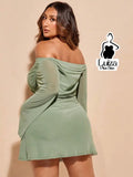 Vestido Curto Ombro A Ombro Manga Flare Drapeado Plus Size