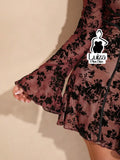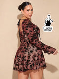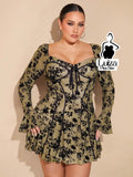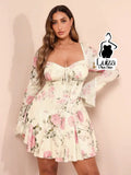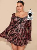 Vestido Curto Rodado Floral Manga Longa Flare Plus Size