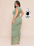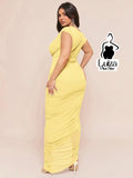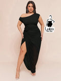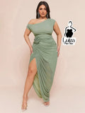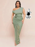 Vestido Longo Um Ombro Só Drapeado Detalhe Floral Plus Size