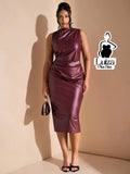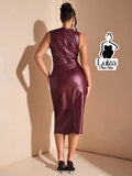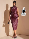 Vestido Midi Couro Sintético Drapeado Na Cintura Plus Size
