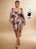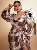 Vestido Midi Estampado Manga Bufante Fenda Frontal Plus Size